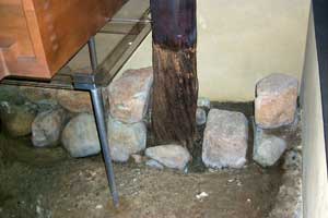 この搾り場が使われなくなったときに切断された男柱は、腐らず地下の構造が良く残っているため、保存処理をしてその上に接ぎ木をして復元されています。周囲の大きな石には、男柱が浮き上がらないようにする重しの役割を持っています。