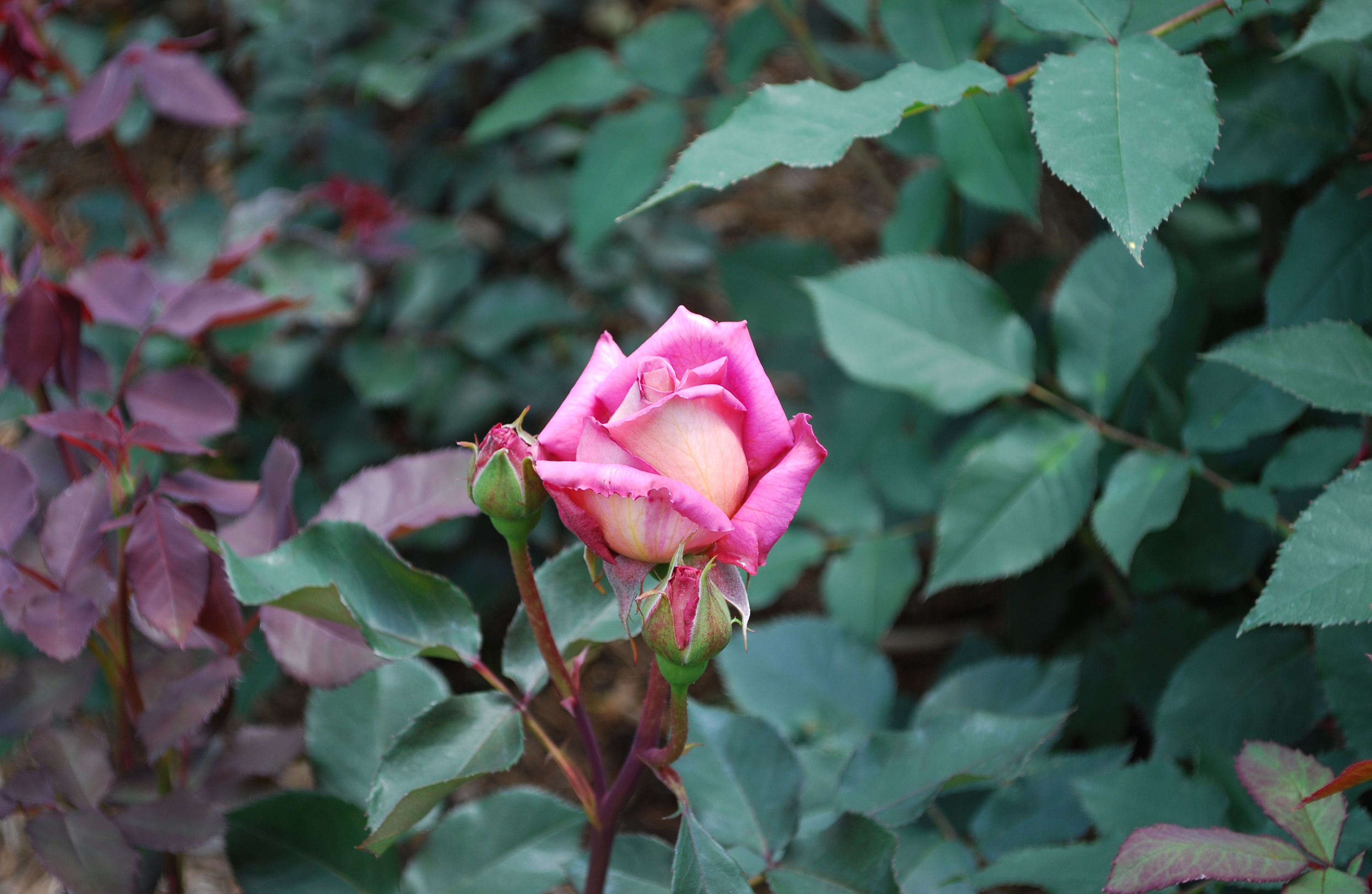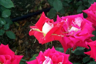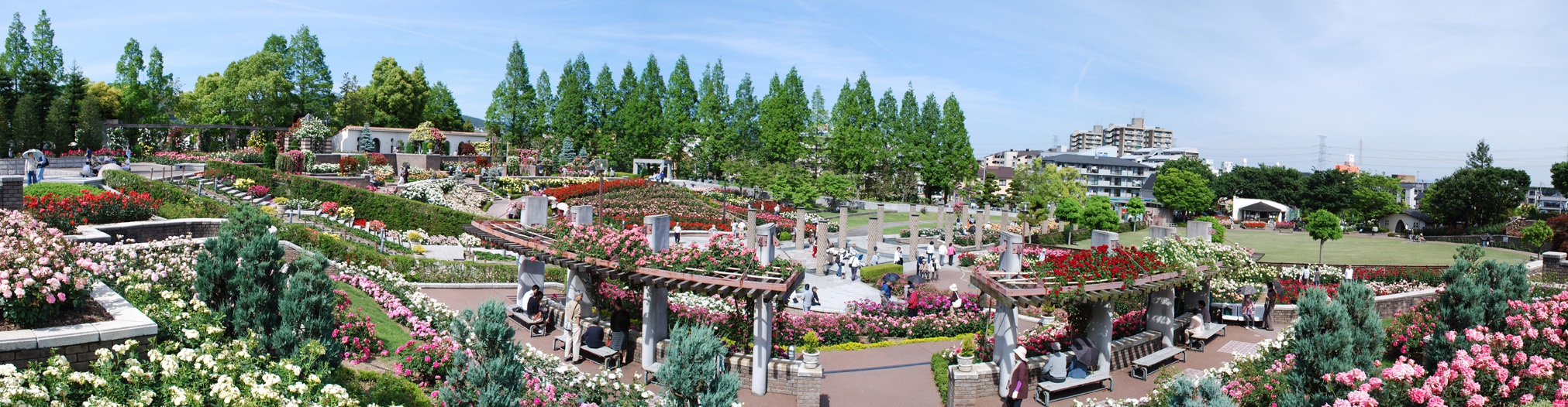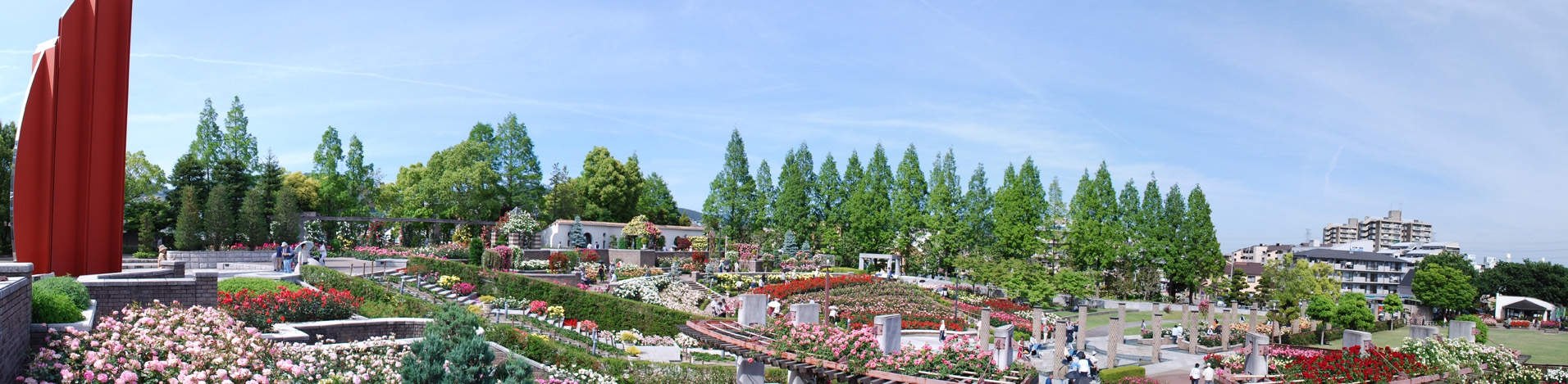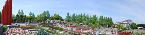 伊丹市の北部、荒牧にバラ公園があります。世界中のバラ約200種1万本が園内一帯に咲き誇っています。開花の最盛時期は5~6月と10~11月です。開花情報園内には3本柱が立っている下に地下ホールがある平和モニュメントもあります。