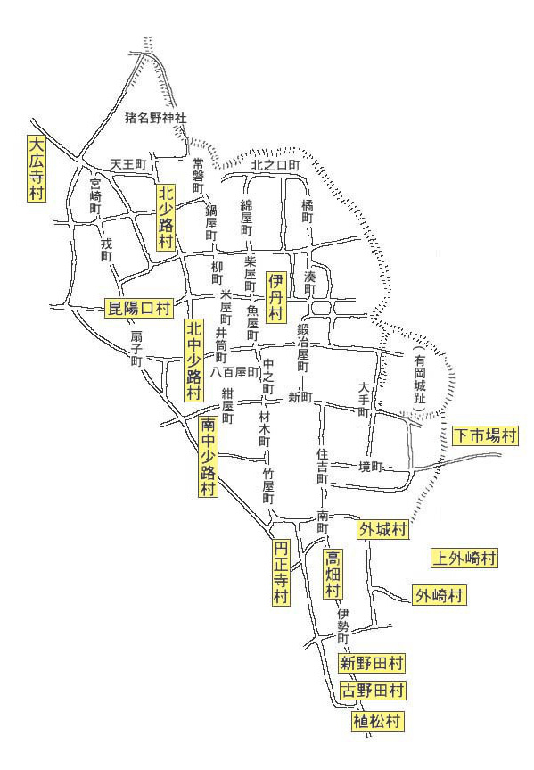 伊丹郷町が江戸時代中期には、伊丹村、大広寺村、北少路村、昆陽口村、北中少路村、南中少路村、下市場村、上外崎村、外崎村、外城村、高畑村、円正寺村、新野田村、古野田村、植松村 で構成されていました。