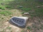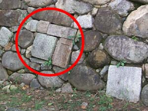 発掘された石垣の一部には、自然石の野面積みに混じって、五輪塔などの台石が無造作に突っ込まれているのが、見えます。