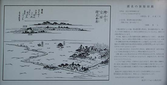 その後、荒涼とした笹の原野が次第に開墾されでいく中で、一画の笹原が残され、人びとに猪名の笹原の旧蹟として伝えられてきたようで、正保二年(西暦1645年)頃の摂津国絵図の中にこの他が「いなの小笹」と記され、寛政十年(西暦1798年)頃の摂津名所図会には「猪名笹原」とあります。(図の左半分に小さく示されています)